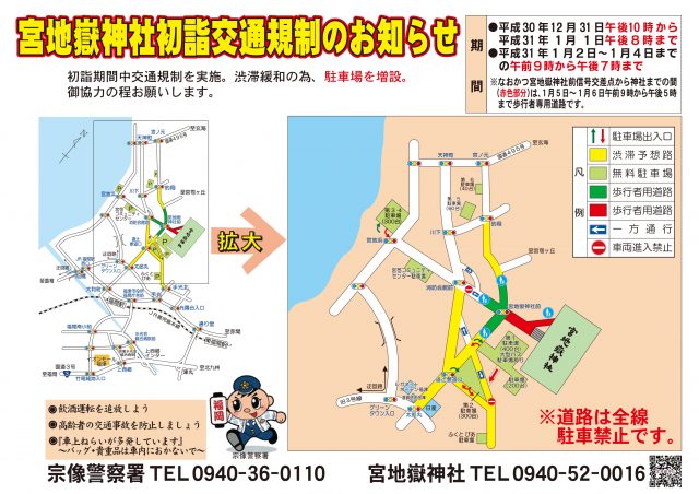 初詣期間中、宮地嶽神社周辺では 平成30年12月31日(月)〜平成31年1月6日(日)交通規制が実施されます。渋滞緩和の… 続きを読む