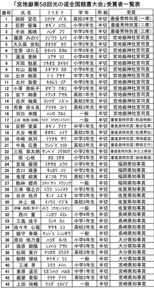 宮地嶽第58回光の道全国競書大会【受賞者一覧】