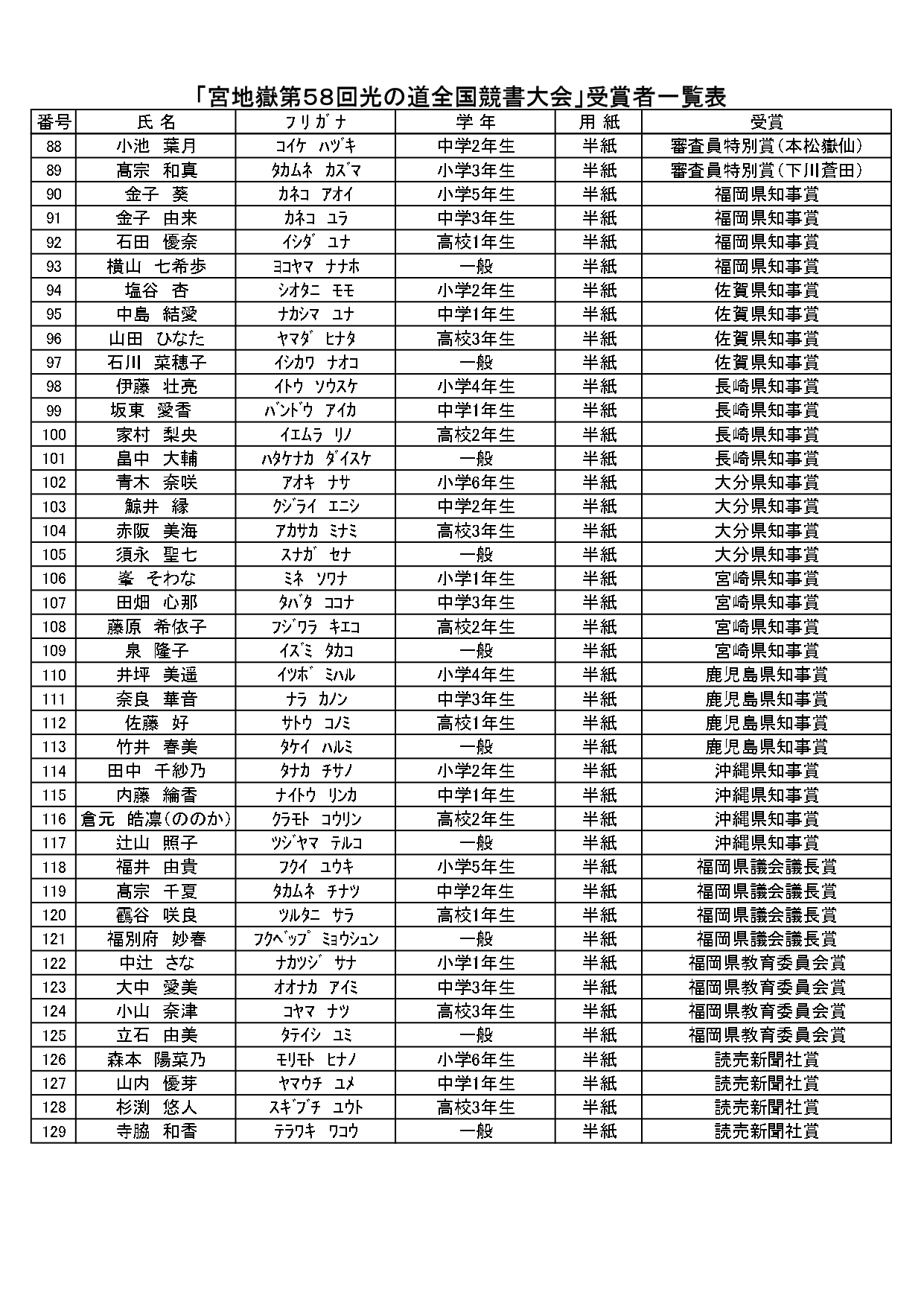 宮地嶽第58回光の道全国競書大会【受賞者一覧】