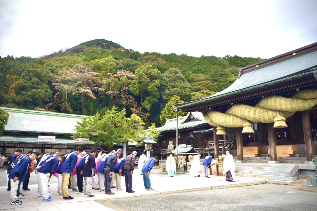 お知らせ 令和7年12月20日 お知らせ一覧 大注連縄奉鎮 早朝より清雨が降り、境内をお清め。そして午後3時過ぎ無事『令和8年大しめ縄』を奉鎮。かけ替えに携わって頂きました皆様方に感謝申し上げます。どうぞ良いお年をお迎えください。